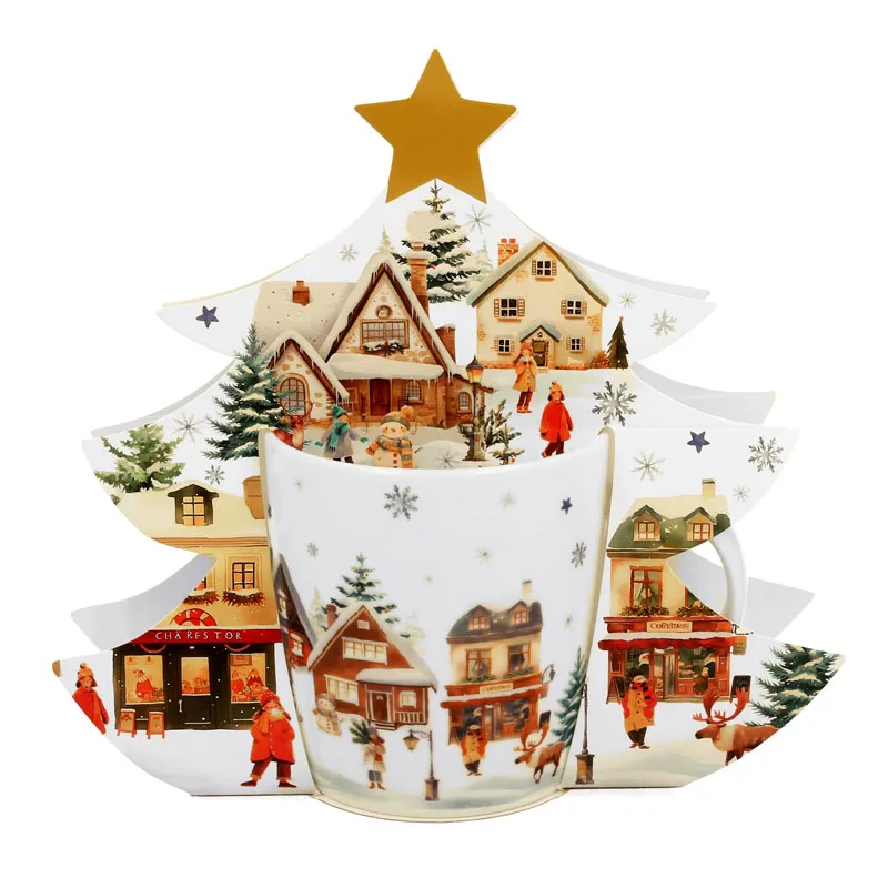 Skodelica božični motiv, CHRISTMAS VILLAGE, v darilni embalaži v obliki smrekice, 400ml, new bone, 9.3cm