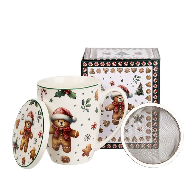 Skodelica s pokrovom in cedilko božični motiv, CHRISTMAS CUTIES, v darilni embalaži, 360ml, new bone, 11cm