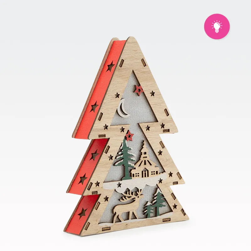 Smrekica, božična dekoracija, z LED lučko, rdeča/pisana, MDF, 20x14x3cm