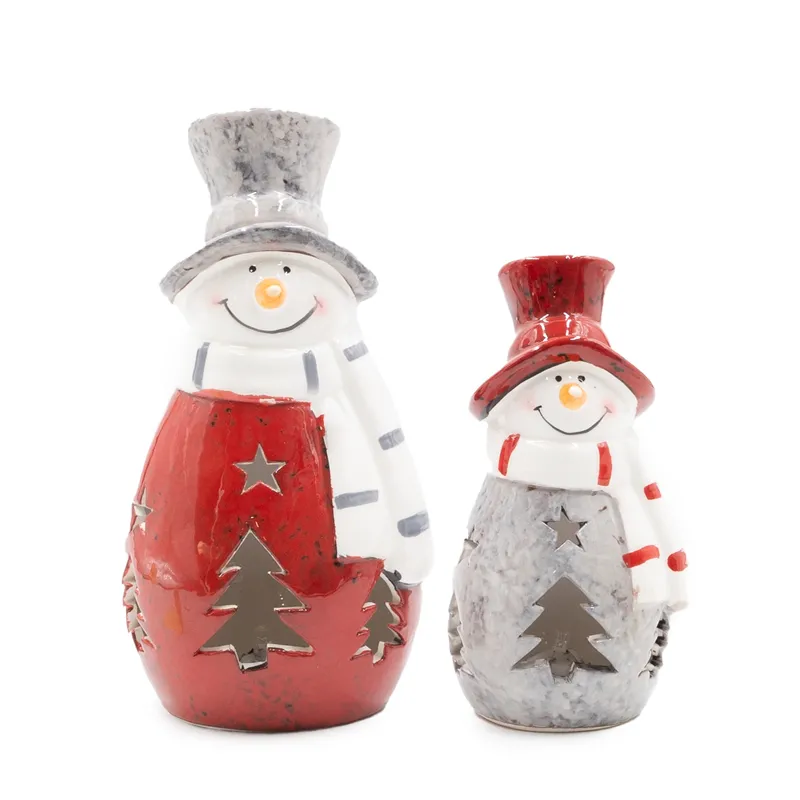 Snežak z rdečim predpasnikom z LED lučko, lončenina, 9.5x9x18.8cm