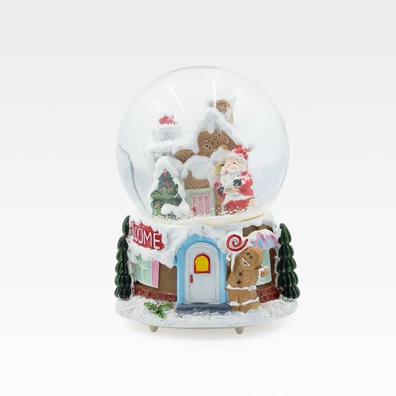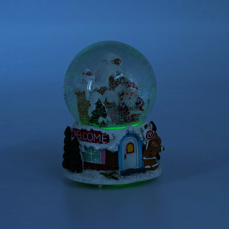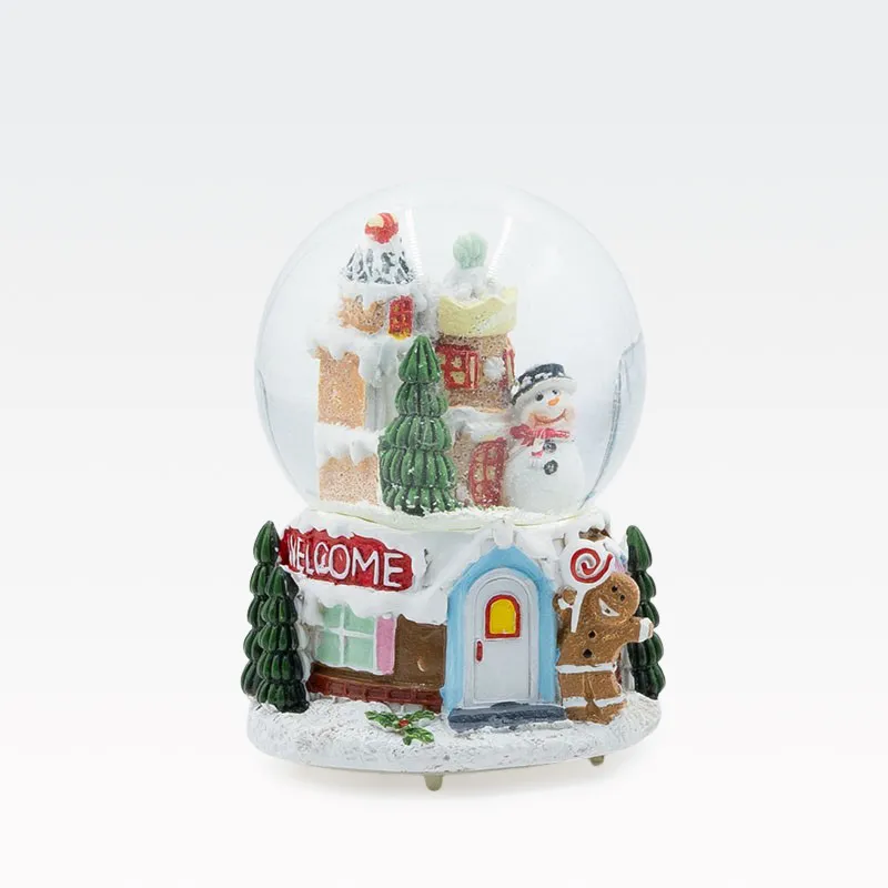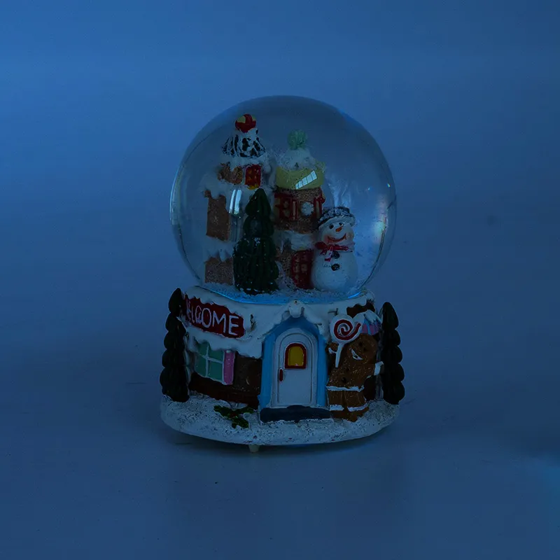 Snežna krogla, zasnežena hišica iz sladkarij, z LED lučko, ter glasbo, polimasa, 9x9x12cm, sort.