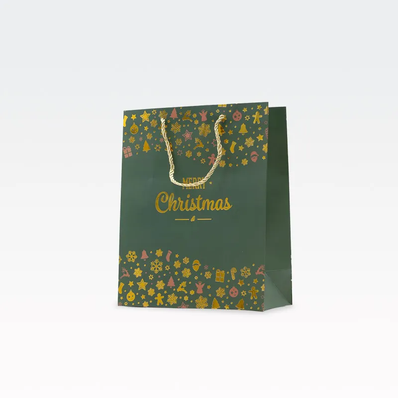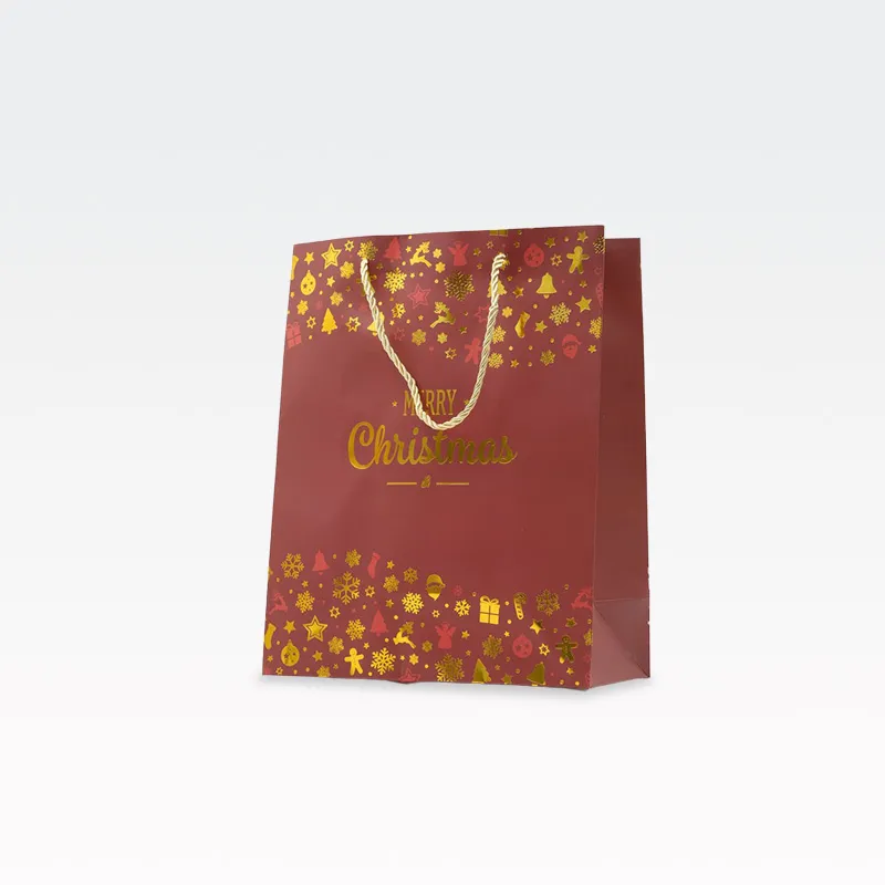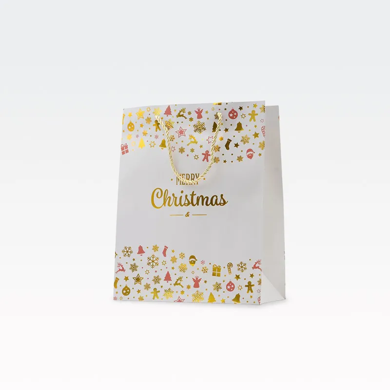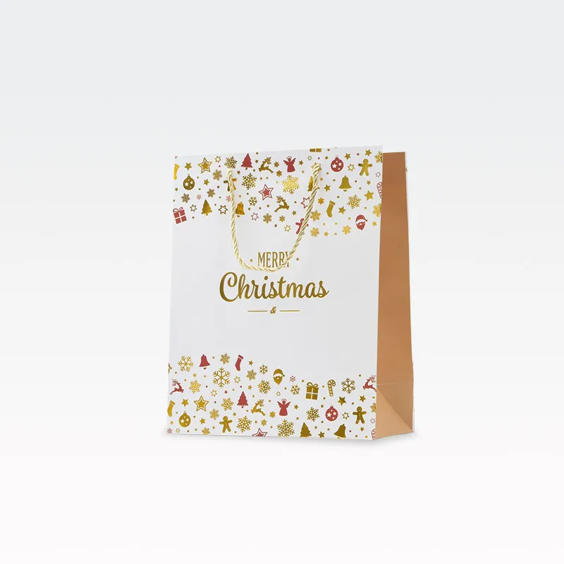 Darilna vrečka dimenzij 23x18x10 cm z napisom "Merry Christmas" je elegantna izbira za zavijanje prazničnih daril. Narejena je iz kakovostnega papirja in na voljo v različnih enobarvnih različicah, ki zagotavljajo prefinjen videz.