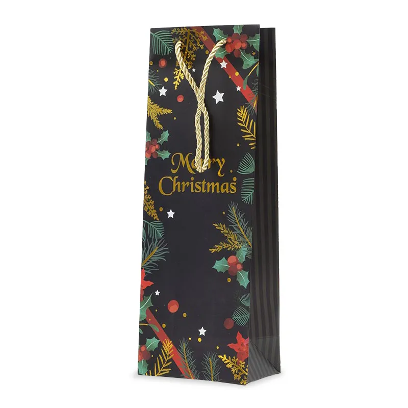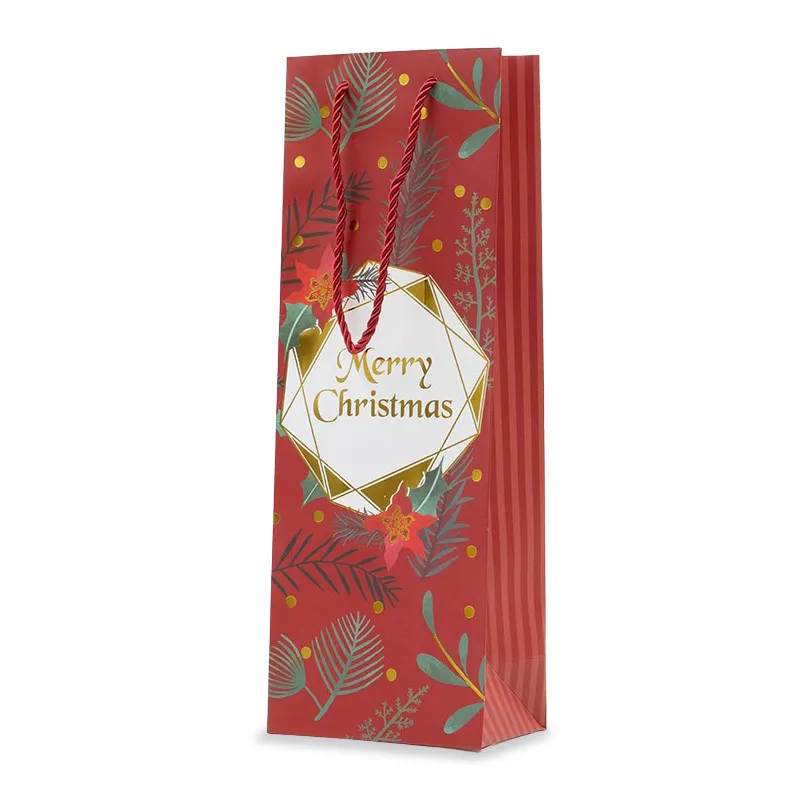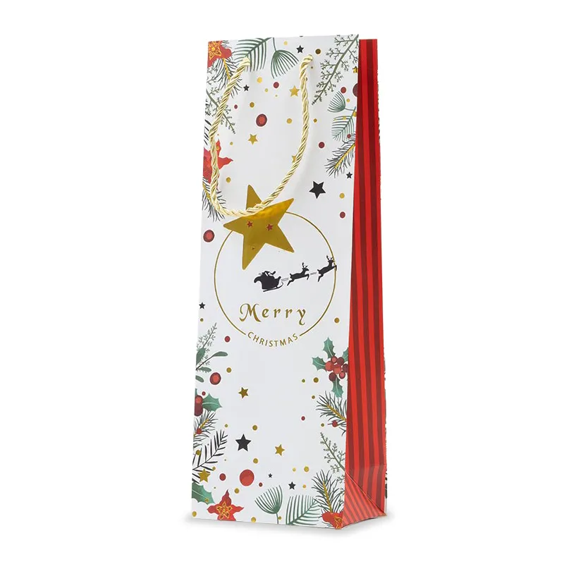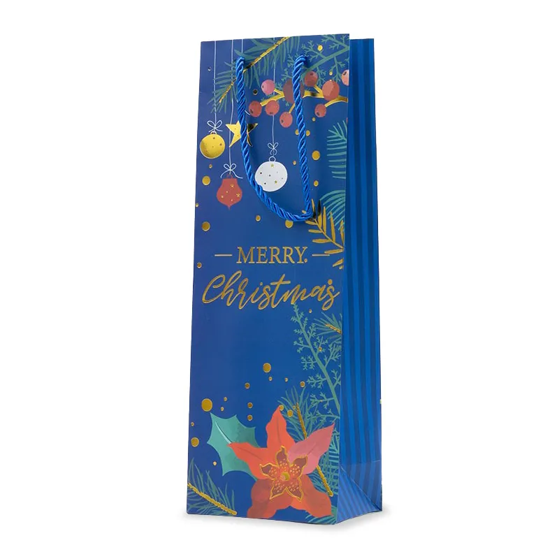 Darilna vrečka dimenzij 36x12.5x8.5 cm z napisom "Merry Christmas" je posebej zasnovana za zavijanje steklenic. Izdelana je iz kakovostnega papirja in na voljo v različnih prazničnih motivih, ki dodajo božično vzdušje.