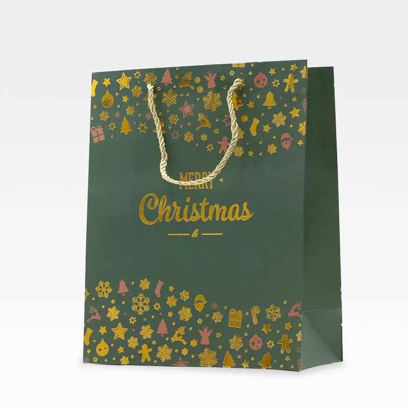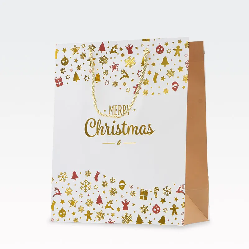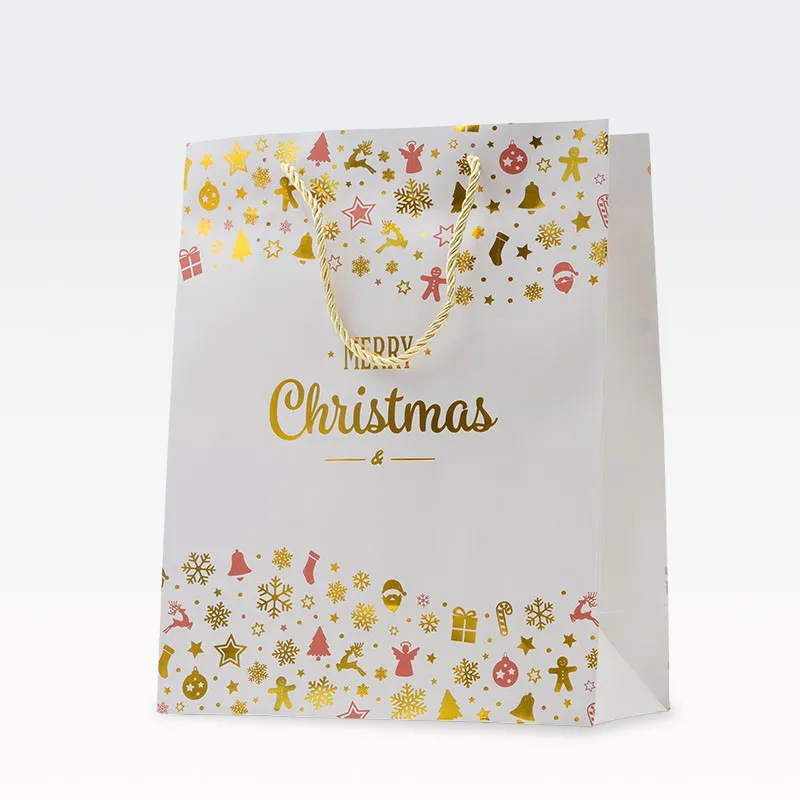 Darilna vrečka dimenzij 40x30x12 cm z napisom "Merry Christmas" je popolna za zavijanje večjih prazničnih daril. Narejena je iz visokokakovostnega papirja in na voljo v različnih enobarvnih različicah, ki ponujajo eleganten in prazničen videz.