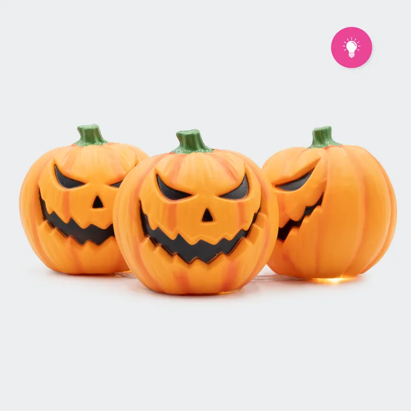 Buča na palici, veriga 3 buč za vrtno dekoracijo je čudovita in privlačna dekoracija za Noč čarovnic, zasnovana posebej za okrasitev vrta ali zunanjih površin. Ta dekoracija vključuje tri buče, ki so medsebojno povezane in pritrjene na palico. Vsaka buča ima vgrajeno LED lučko, ki omogoča, da svetijo in ustvarjajo čaroben svetlobni učinek v temi. Izdelek je izdelan iz umetne mase, kar zagotavlja vzdržljivost in odpornost na vremenske vplive.