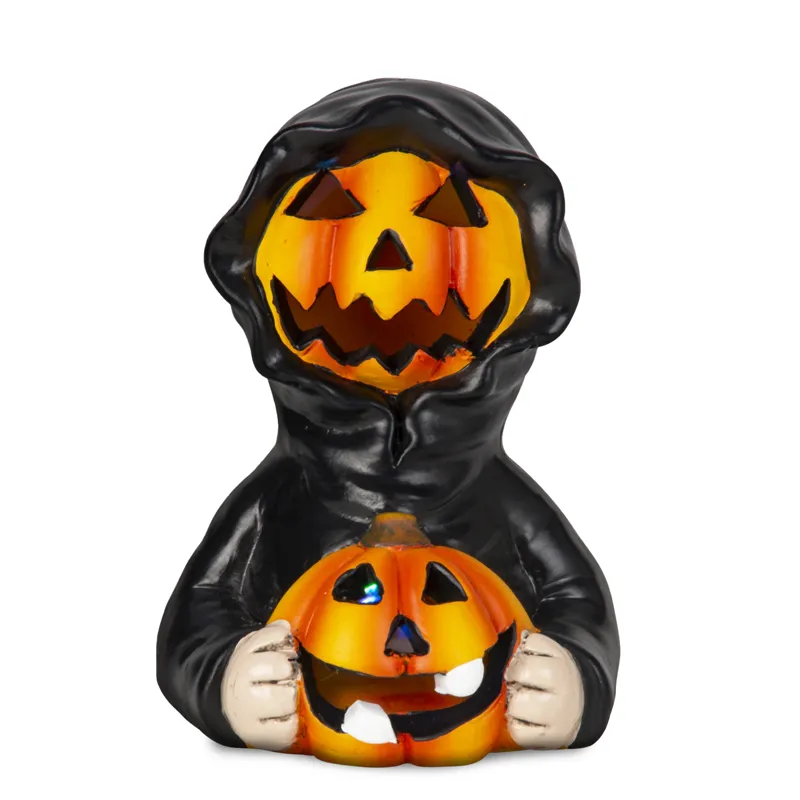 Buča v črnem ogrinjalu, držeča bučo, z LED lučko, polimasa, 13.5x10cm