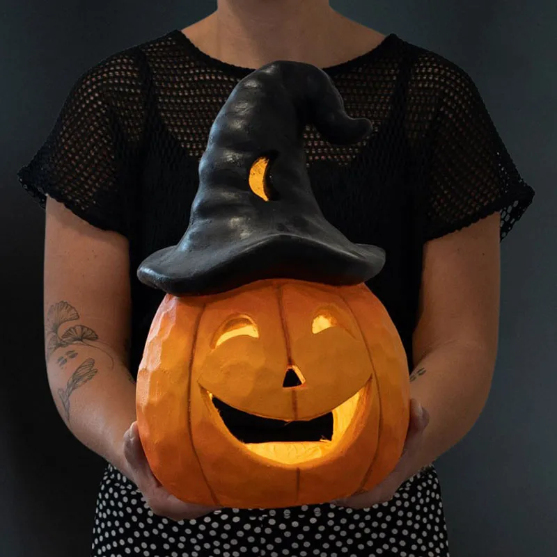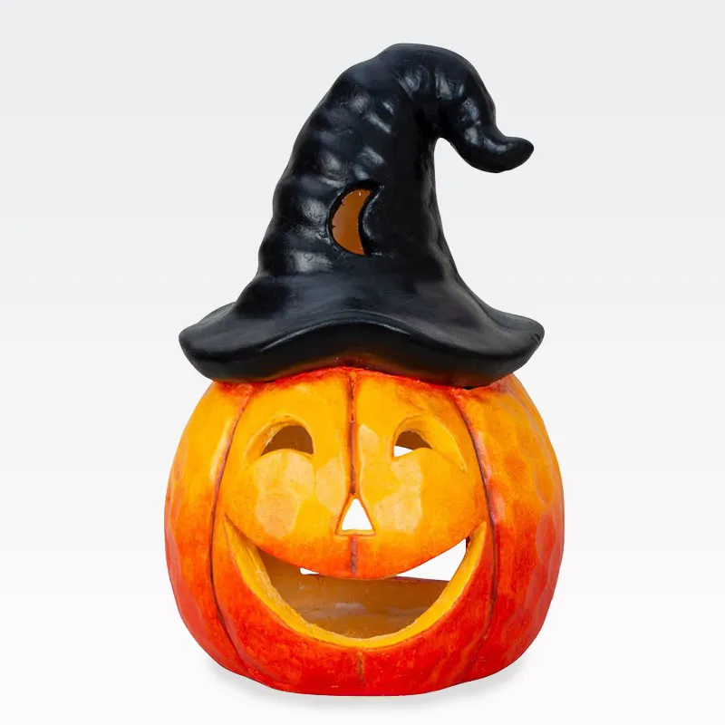Ta dekorativna buča je oblikovana z elegantnim s klobukom, ki daje edinstven pridih tradicionalnemu okrasnemu elementu, priljubljenem v času noči čarovnic in jesenskih sezon. Zasnovana je tako, da služi kot svečnik za čajno lučko, ki ustvarja čaroben ambient, ko je sveča prižgana. Glavne značilnosti: