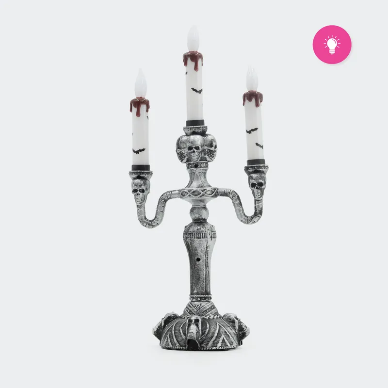 Vgrajena LED lučka zagotavlja varno in dolgotrajno osvetlitev, ki oddaja pritajeno svetlobo, primerno za noč čarovnic. Svečnik je idealen za postavitev na mizo, polico ali v okensko polico, kjer bo dodal srhljiv pridih prostoru. Zaradi svoje svetlobne funkcije in klasičnega strašljivega dizajna je popoln za dopolnitev vaše praznične dekoracije.