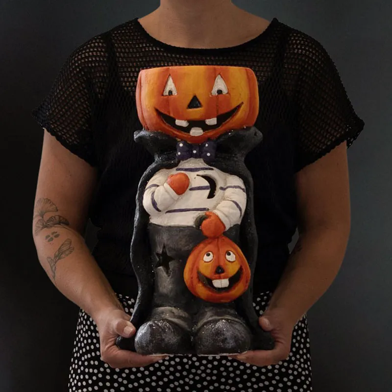 Ta kip vampirja z bučno glavo je prava paša za oči, idealen za vse, ki želijo dodati pridih edinstvenosti svoji jesenski ali Halloween dekoraciji. Vpadljive bleščice in LED osvetlitev bodo zagotovo navdušile obiskovalce vašega doma.