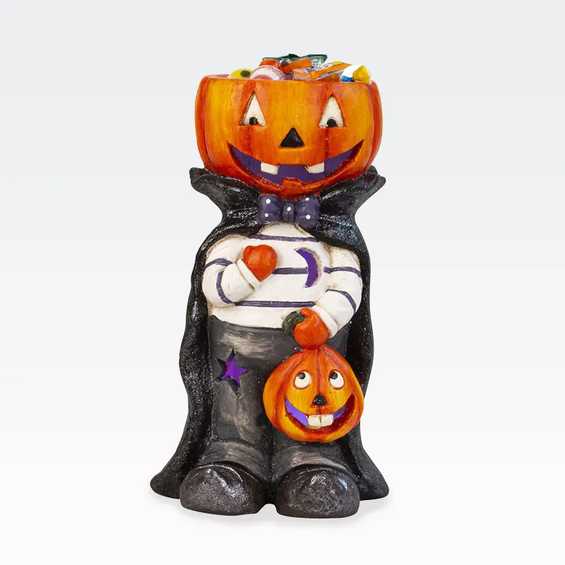 Ta nenavaden, a izjemno zanimiv kip vampirja z glavo iz buče je prava izbira za vse, ki želijo svojemu domu ali vrtu dodati pridih noči čarovnic. Osvetljena z LED lučko in posuta z bleščicami, ta dekoracija ne samo da pritegne poglede, temveč tudi dodaja praznično atmosfero.