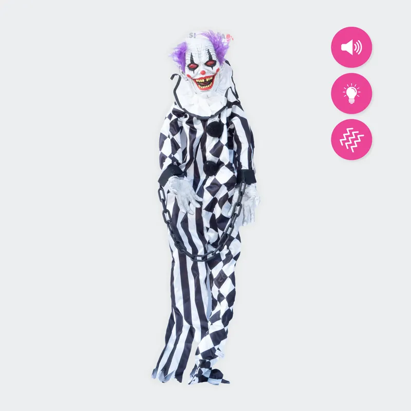Klovn je opremljen s funkcijo tresenja, kar dodaja element premikanja, ki posnema trepetanje strahu. Spremljajo ga zvočni učinki, ki še povečujejo njegov strašljivi vpliv, in LED oči, ki svetijo, kar dodatno poudarja njegov grozljiv videz. Ta viseča dekoracija je enostavna za namestitev na različne lokacije, kot so drevesa, stropi ali verande, in je odlična izbira za dodajanje srhljive dimenzije na vašem vhodu ali kot del tematske zabave.