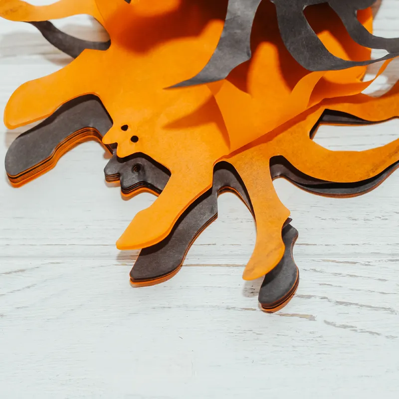 Girlanda je izdelana iz trpežnega materiala v črni barvi, ki je tipična barva za to praznovanje. Na njej so lahko različni motivi, kot so pajki, netopirji, čarovniški klobuki, buče, lobanje in drugi simboli povezani s Halloweenom. Te tematske podrobnosti ustvarjajo unikatno vzdušje in dodajo pridih skrivnostnosti.