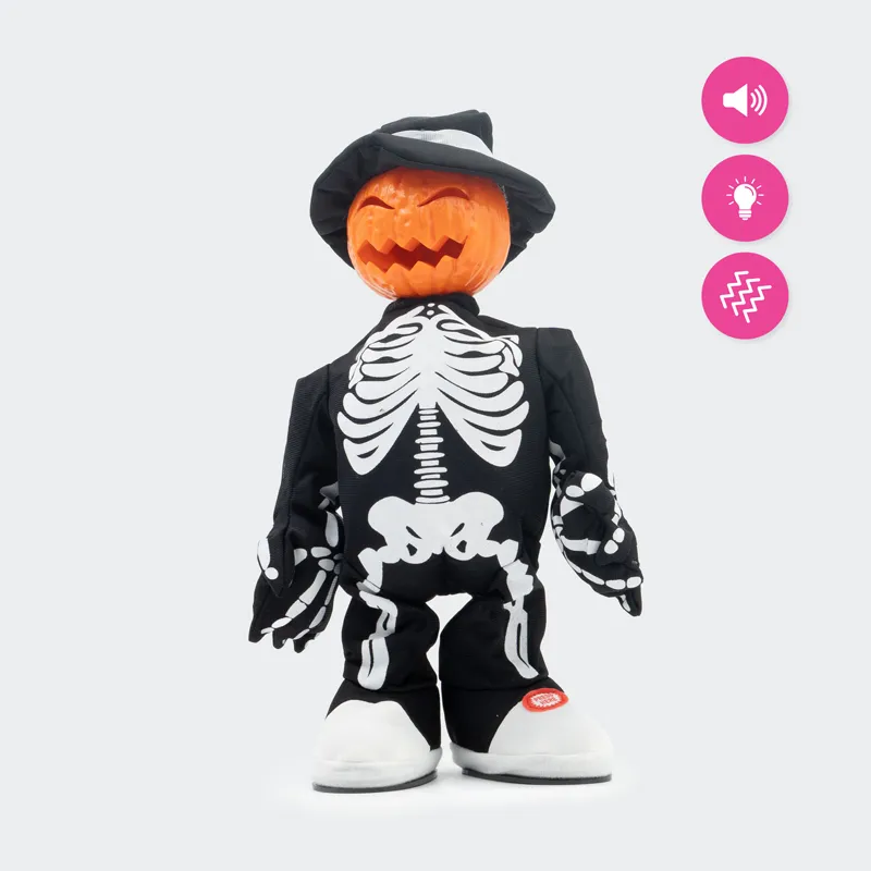 Okostnjak, plesoč je zabavna in interaktivna dekoracija za Noč čarovnic. Ta okostnjak je velikosti 33 cm v višino in 21 cm v širino, izdelan pa je iz materialov, ki zagotavljajo njegovo trpežnost in enostavno vzdrževanje.