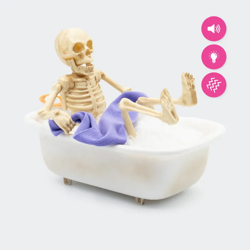Ta okostnjak ni le vizualno privlačen, ampak je tudi premikajoč se in opremljen z zvočnimi učinki, ki dodajo atmosfero strahu in zabave. Ko ga aktivirate, okostnjak v kadi začne izvajati različne gibe, hkrati pa oddaja zvoke, ki so značilni za strašljive scene, kar še povečuje učinek presenečenja in zabave med gosti.
