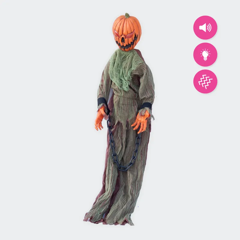 Strašilo buča, viseče, tresoče, z zvokom in LED očmi, umetna masa/blago, 130x28cm