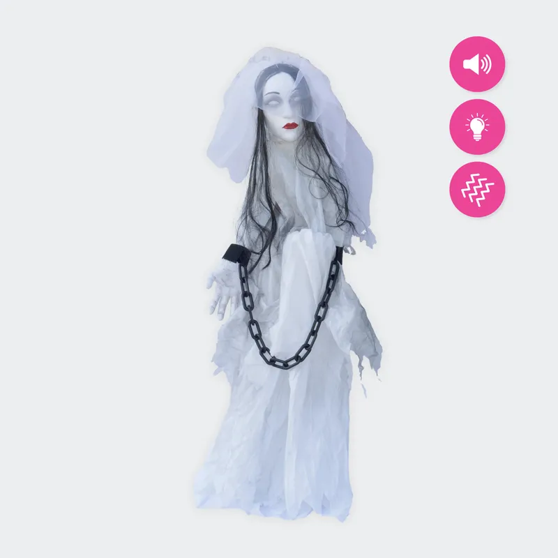 Strašilo predstavlja postavo neveste v strašljivi preobleki in je opremljeno s funkcijo tresenja, ki posnema premikanje, kot bi nevesta neživo visela v zraku. Dodani zvočni učinki povečujejo srhljivo vzdušje, LED oči, ki svetijo, pa poudarjajo grozljiv videz neveste. Ta viseča dekoracija je enostavna za obešanje na različnih mestih, kot so veje, verande ali stropi, zaradi česar je odlična izbira za ustvarjanje zlovešče atmosfere na vhodu ali kot osrednja točka zabave.