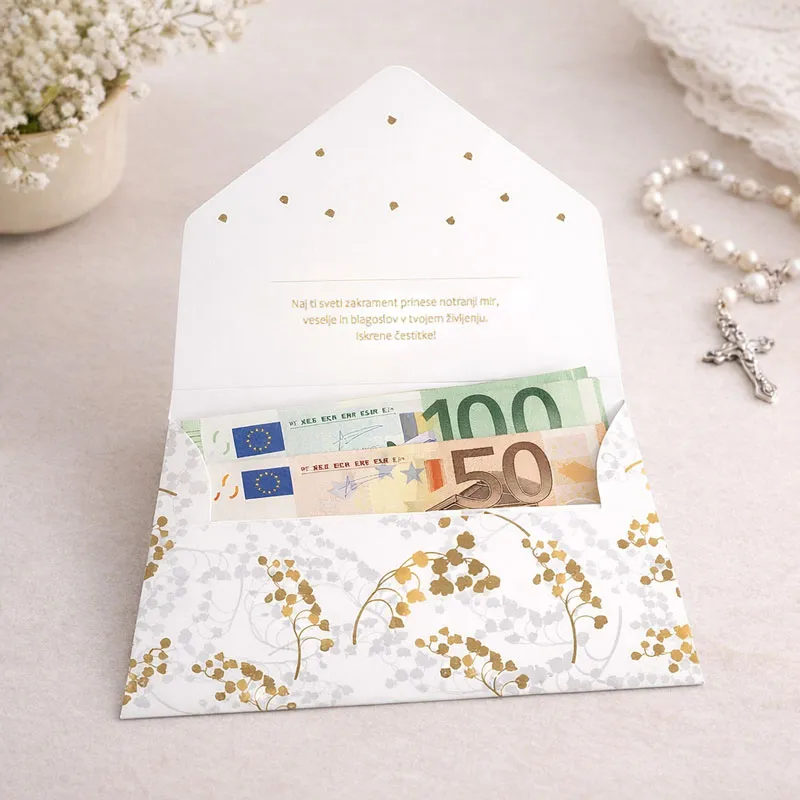 Darilna kuverta za denar z napisom »Sveti zakrament« v elegantni zlati barvi je čudovit dodatek ob posebnih verskih priložnostih. Primerna je za obdarovanje ob svetem krstu, prvem svetem obhajilu, birmi ali drugih pomembnih cerkvenih dogodkih.