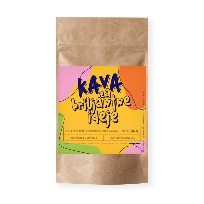 Mleta kava »Kava za briljantne ideje« je odlična izbira za vse, ki dan začnejo z dobro kavo in novimi zamislimi. Kakovostna mleta kava iz 100 % arabice navduši z bogato aromo in polnim okusom, zabaven napis pa poskrbi za dodatno motivacijo. Popolna je kot darilo za sodelavce, prijatelje ali vse, ki radi ustvarjajo, razmišljajo in načrtujejo nove ideje.