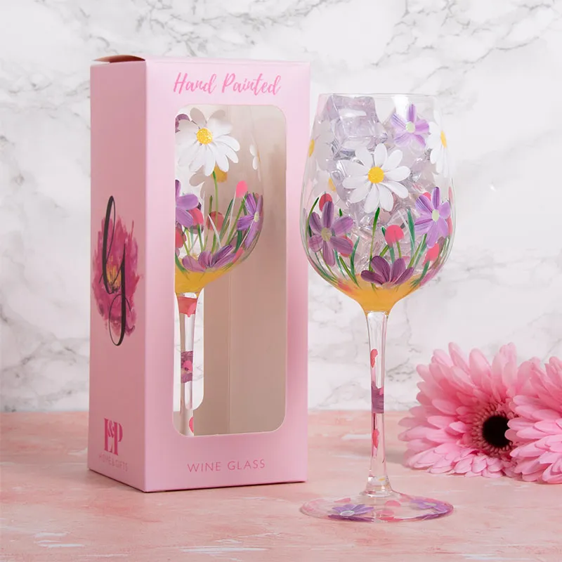 Kozarec za vino poslikan, marjetice, 23cm, v darilni embalaži