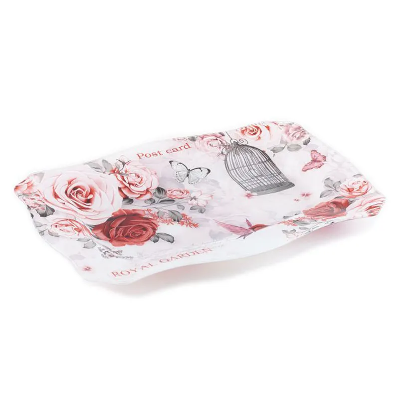 Steklen dekorativni pladenj z motivom vrtnic in valovitim robom je popoln dodatek za vse, ki cenijo eleganco in prefinjene detajle. Romantičen cvetlični motiv v kombinaciji z valovitim robom ustvarja klasičen, a sodoben videz, ki se lepo poda k vsakemu pogrinjku. Pladenj je idealen za serviranje slaščic, sadja, prigrizkov ali kot dekorativen element na mizi, komodi ali klubski mizici. Čudovita izbira za darilo ali okras doma.