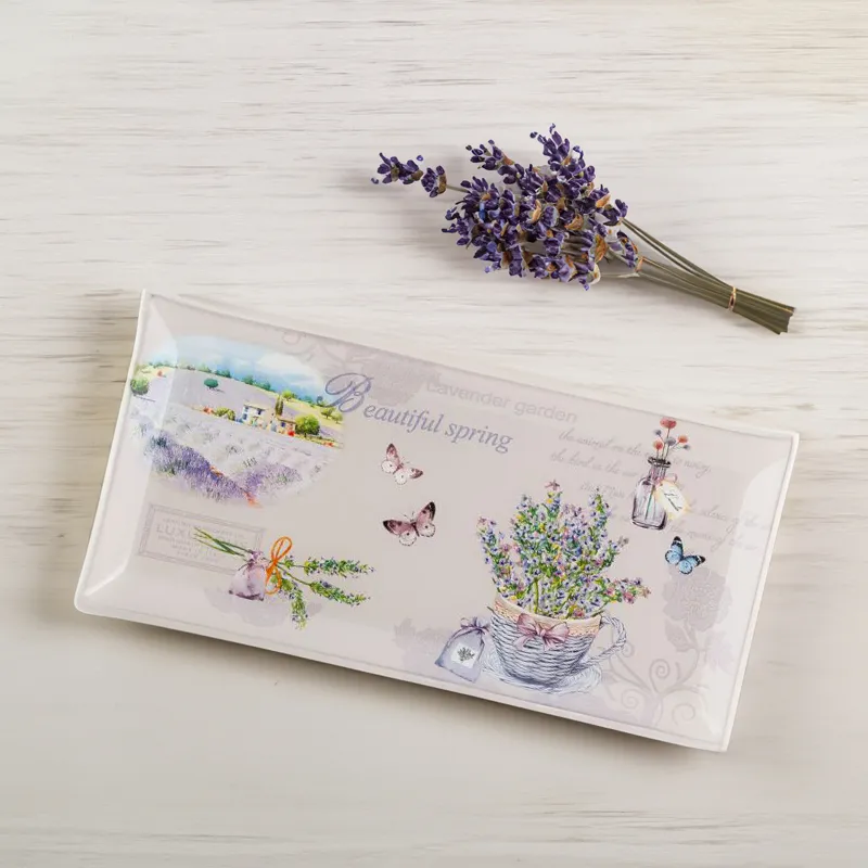 Pladenj je izdelan iz stekla in ima privlačen prozoren videz. Na pladnju je vgrajena sivka, kar mu daje dodaten dekorativni element in dišečo noto.