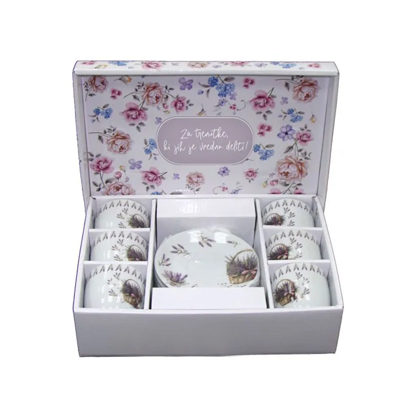 Set skodelic za kavo s podstavki z motivom sivke prinaša pridih francoskega Provanse v vaš dom. Nežen vzorec sivke na beli podlagi ustvarja občutek svežine, miru in topline. Skodelice so popolne za jutranjo kavo, popoldanski čaj ali prijetno druženje v dvoje. Priloženi podstavki poskrbijo za elegantno postrežbo in zaščito površine. Čudovit komplet za vsakodnevno uporabo ali kot darilo za ljubitelje narave in cvetličnih motivov.