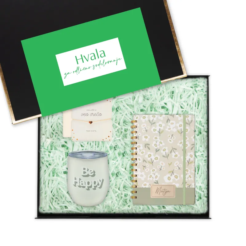 Poslovni paket, namenjen izrazom hvaležnosti za zaupanje in uspešno sodelovanje. Vsebuje elegantno zlato zapestnico, termo lonček za vsakodnevno uporabo ter personaliziran rokovnik, ki združuje praktičnost in osebni pridih. S sporočilom »Hvala za odlično sodelovanje« je popolno darilo za sodelavke, s katerim pokažete spoštovanje in cenite skupne dosežke.