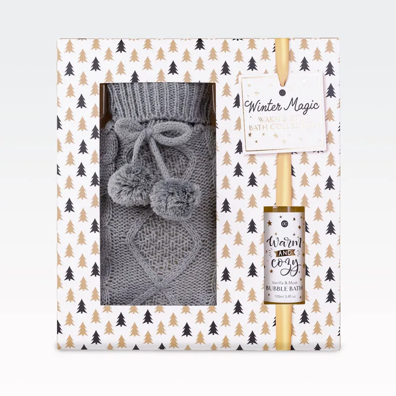 Darilni set WINTER MAGIC, (100ml peneča kopel, termofor oblečen v pulover, 500ml) , z vonjem vanilije, v darilni škatli
