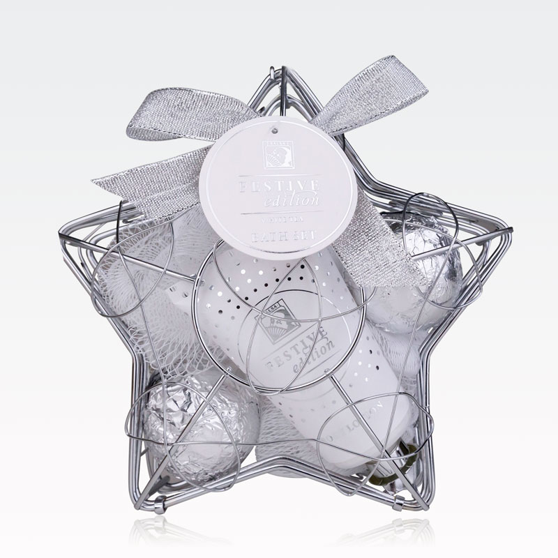 Kopalni set FESTIVE EDITION, (50ml losjon za telo, 2x 40g kopalna kroglica, goba za umivanje), z vonjem White Tea, v koviski košari v obliki zvezde