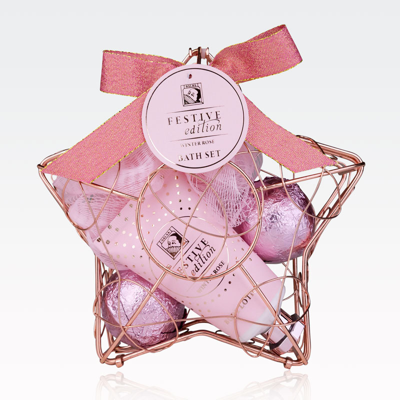 Kopalni set FESTIVE EDITION, (50ml losjon za telo, 2x 40g kopalna kroglica, goba za umivanje), z vonjem Winter Rose, v koviski košari v obliki zvezde