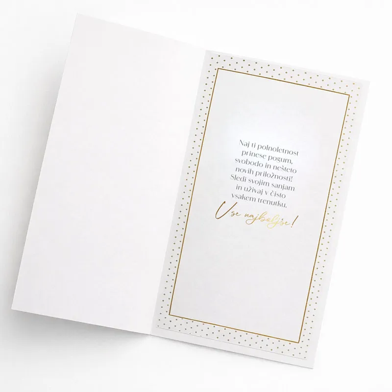 Voščilnica je primerna za voščilo ob dopolnjenem 18. letu in ponuja prostor, kamor lahko zapišete svoje iskrene želje, misli ali zabavno sporočilo za slavljenca ali slavljenko.